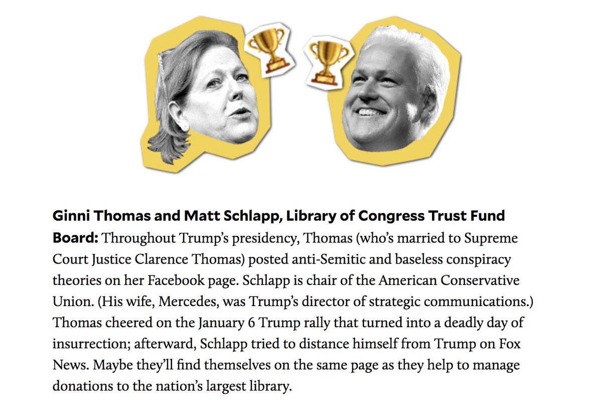 Thomas is married to Supreme Court Justice Clarence Thomas. Schlapp's wife, Mercedes, was Trump’s director of strategic communications. Trump appointed both to the Library of Congress Trust Fund Board.