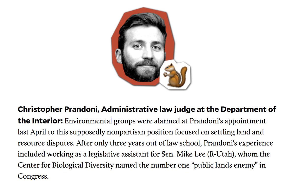 Prandoni once worked for Sen. Mike Lee (R-Utah), whom the Center for Biological Diversity named the number one “public lands enemy” in Congress. Now he’s an administrative law judge at the Department of the Interior.