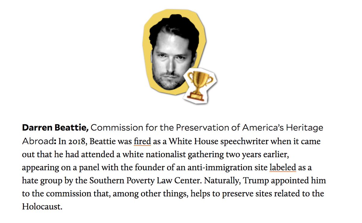 In 2018, Beattie was fired as a White House speechwriter when it came out that he had attended a white nationalist gathering two years earlier. Naturally, Trump appointed him to the commission that, among other things, helps to preserve Holocaust sites.
