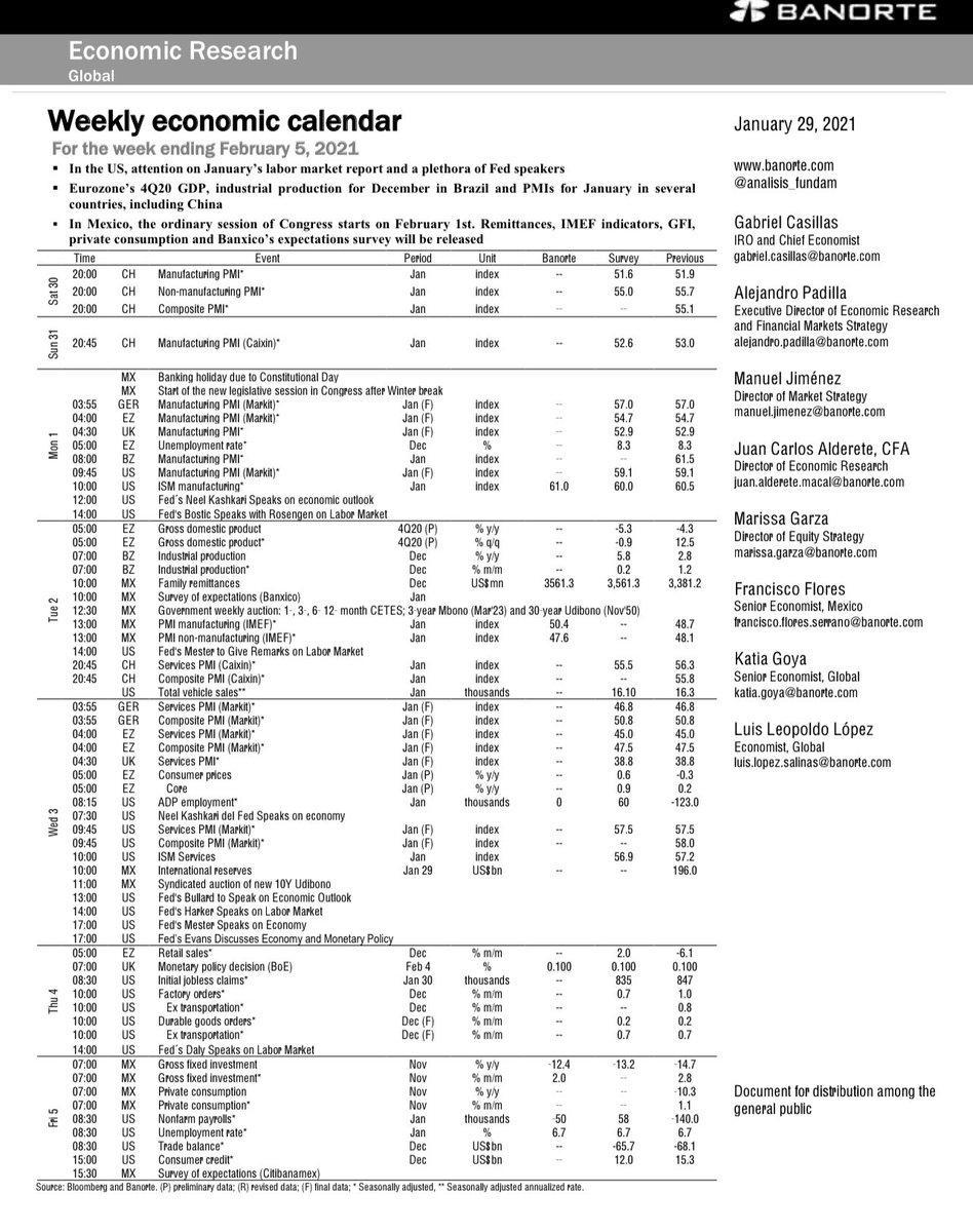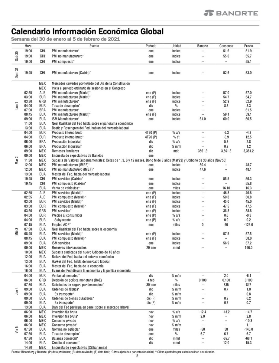 Asimismo, el mdo continuará poniendo atención a los reportes corporativos trimestrales y el @bankofengland tendrá su reunión de pol mon. También se publicarán los PMIs de enero a nivel global, el PIB de 4T20 y la inflación de enero en la Eurozona