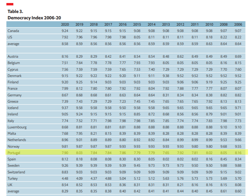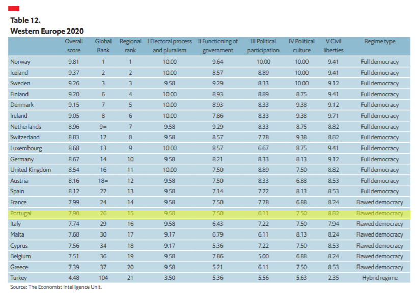 Portugal na verdade é uma "Democracia Imperfeita" desde 2011, tendo apenas no ano passado obtido o estatuto de "Democracia Plena" por pequena margem.