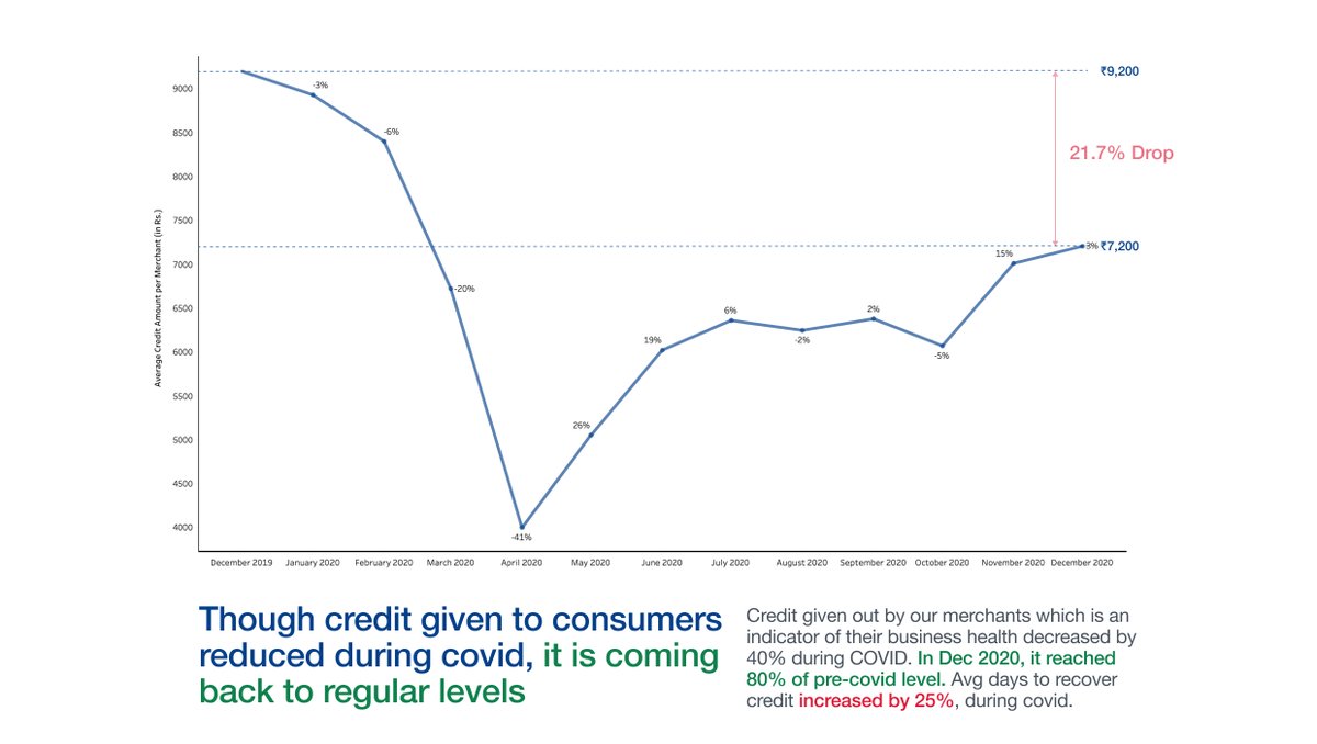 COVID impact: Credit given out by our merchants, which is an indicator of their business health, dropped by 40% during the initial months of COVID. It has continued to recover to 80% of pre-pandemic levels by December. Average days to recover debts increased by 25% during COVID.