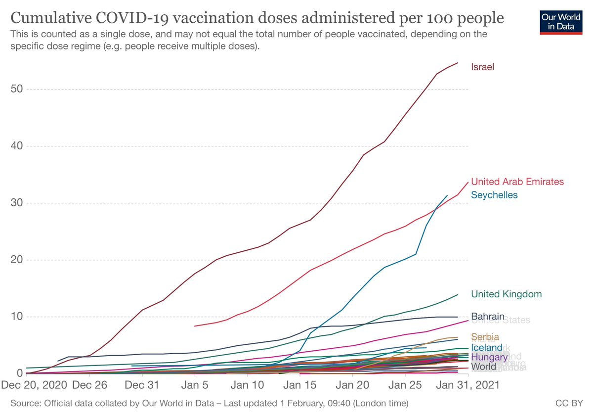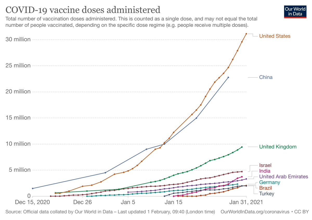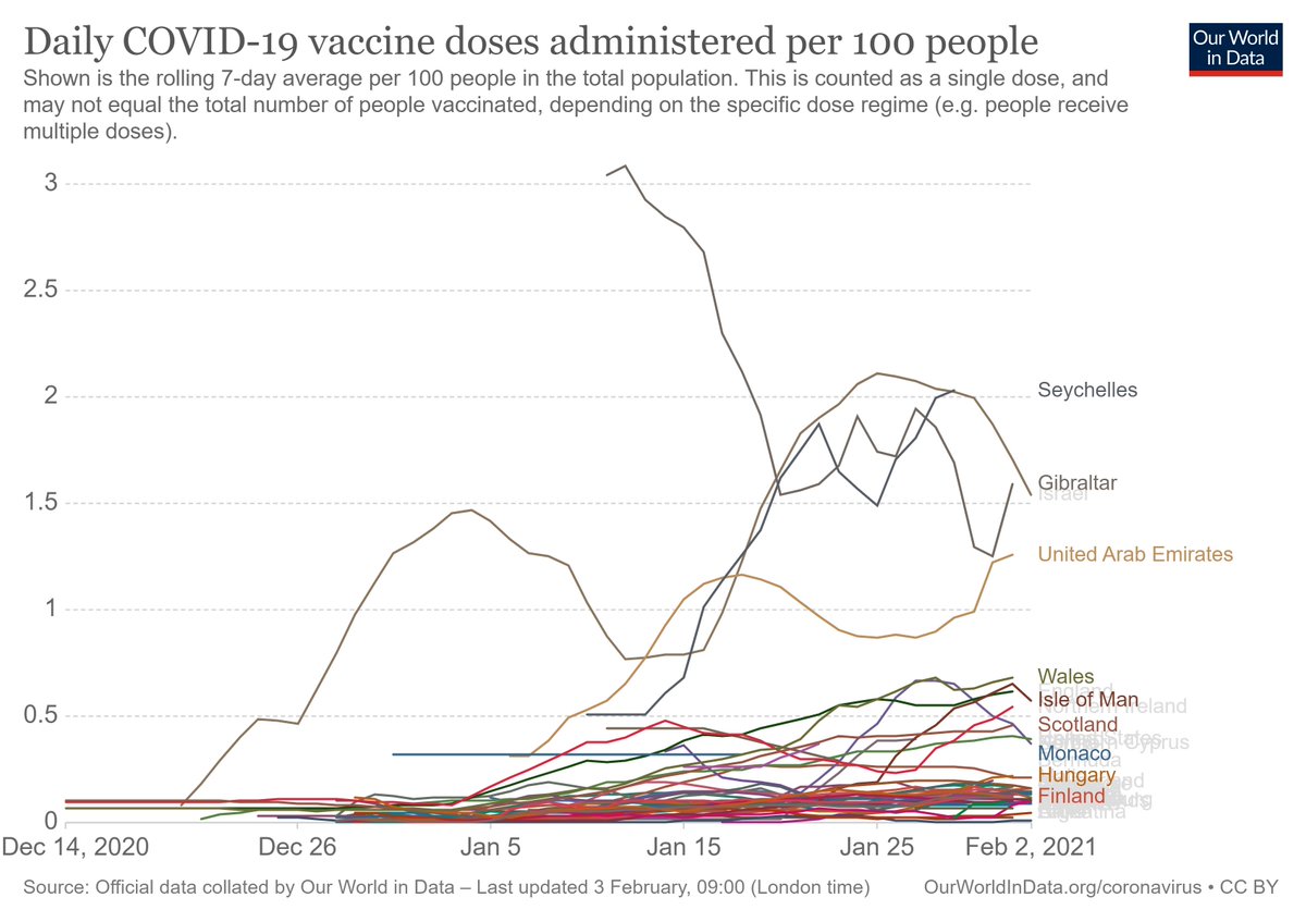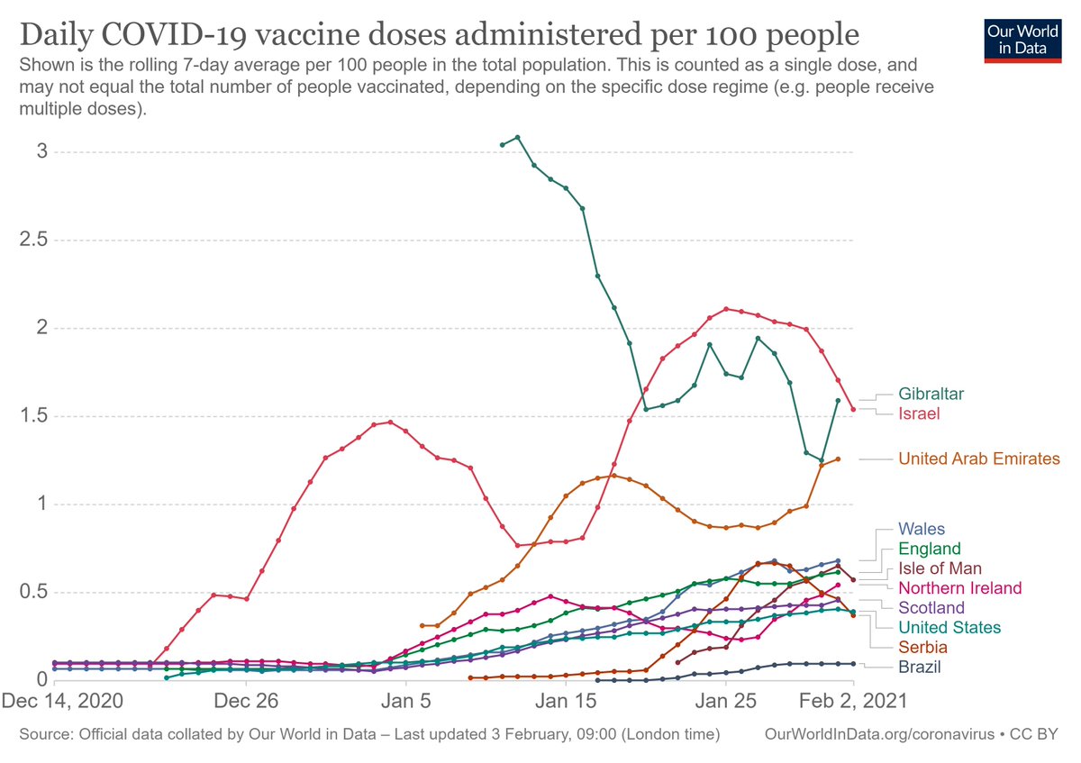 Tanto em % da população que recebeu uma dose quanto total, a diferença é gigantesca. Na verdade, gigantesca ate em relação ao segundo colocado.