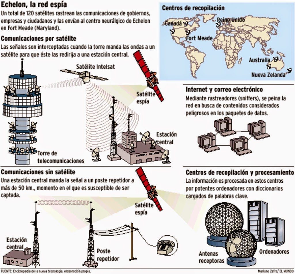 . Los Estados Unidos, con su gran cadena de satélites espías y puertos de escucha controlan gran parte de Latinoamérica, Asia, Rusia asiática y el norte de China.