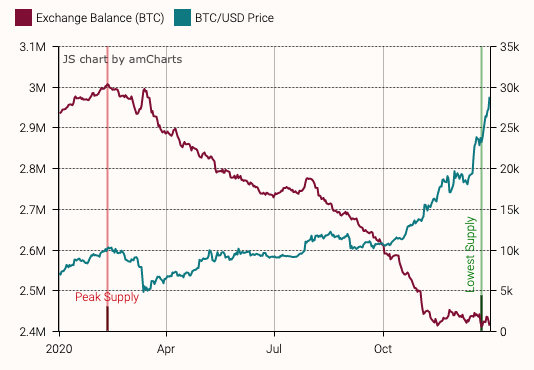#Bitcoin supply began to squeeze in October 2020 when looking at available supply on exchanges, according to data by @glassnode. Last year saw over 600k #BTC leaving exchanges. 1/7