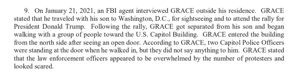 Jeffrey Grace of Washington was captured in the background of one of the most widely seen photos of the insurrection at the Capitol. When the FBI found him, he told agents he'd gone to DC to hear Trump speak, got separated from his son and followed a crowd into the building...