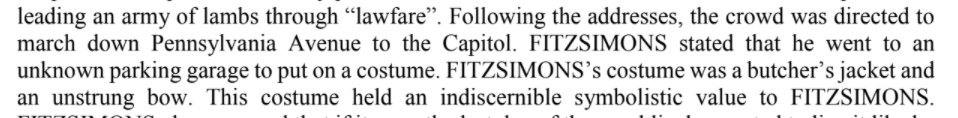 Fitzsimons did this, the feds say, in butchers' whites and carrying an unstrung bow--a costume that held "an indiscernible symbolic value" to him.