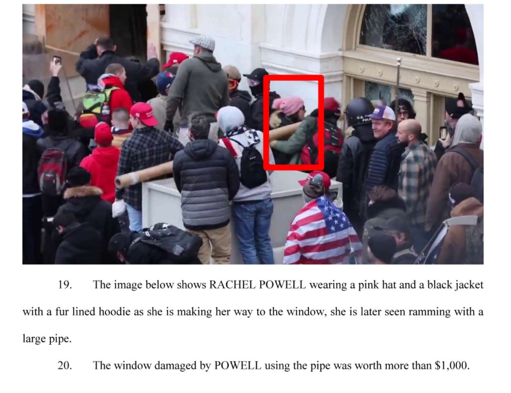 The FBI has photos of her in a pink hat using a large pipe to smash a window at the Capitol, causing $1000 in damage.