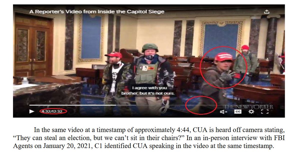 In Cua's complaint, the FBI included a screenshot from the New Yorker video showing him standing near former LTC Larry Brock. "They can steal an election," Cua can be heard saying, "but we can't sit in their chairs?"