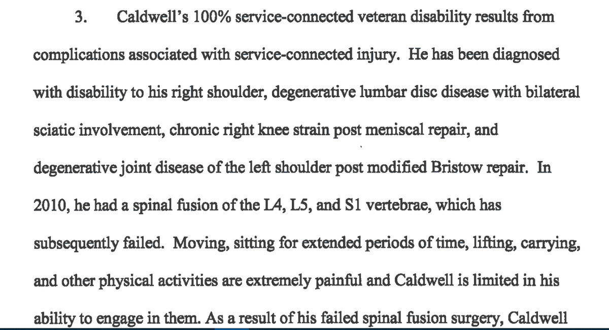 Caldwell, who denies being in the Oath Keepers, is seeking release from custody in new court papers referencing his numerous physical problems "associated w/service-connected injury."