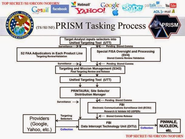 El FBI obtiene la información recogida por una empresa privada que colabora, tales como Microsoft o Yahoo, y la pasa a la NSA sin ninguna revisión adicional.