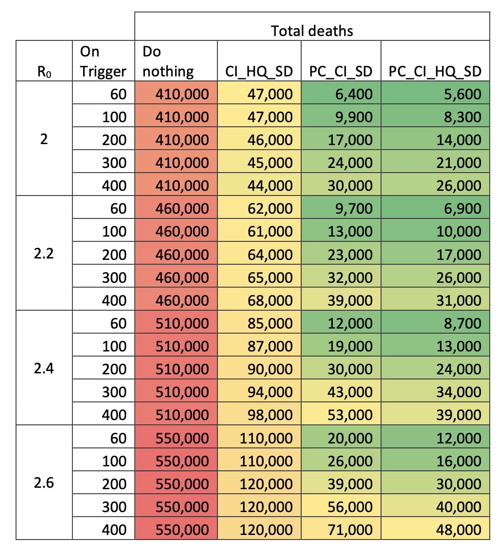 Mesmo com o pior R0 e o trigger mais alto (400), as intervenções levariam algo entre 48 e 120 mil obitos EM 2 ANOS, o RU tem 110 mil óbitos EM 1 ANO.