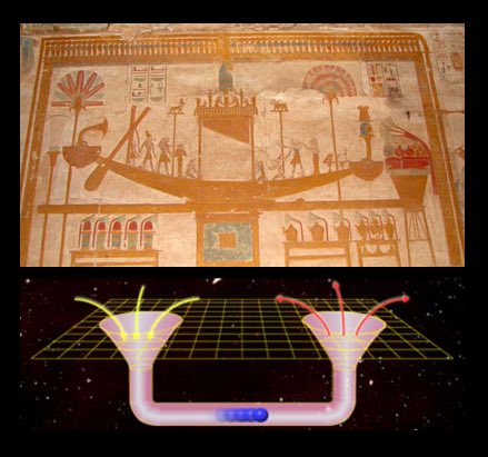 Arriba pueden ver un modelo de agujero de gusano cósmico en comparación con el "dispositivo de Osiris", que coincide con la teoría de Kurt Gödel, que por el hecho de que nada puede viajar más rápido que la luz, un "atajo" podría ser abierto en ciertas coordenadas del espacio,
