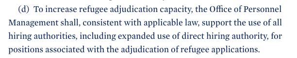 The federal gov't is going to need a lot more people to work on refugee adjudications, & @USOPM is called on to make "expanded use of direct hiring authority"—this allows qualified applicants to skip a lot of the usual civil service hiring requirements.