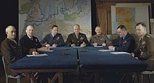 Left to right: Lieutenant General Omar N. Bradley, Admiral Sir Bertram Ramsay, Air Chief Marshal Sir Arthur Tedder, General Dwight D. Eisenhower, General Sir Bernard Montgomery, Air Chief Marshal Sir Trafford Leigh-Mallory and