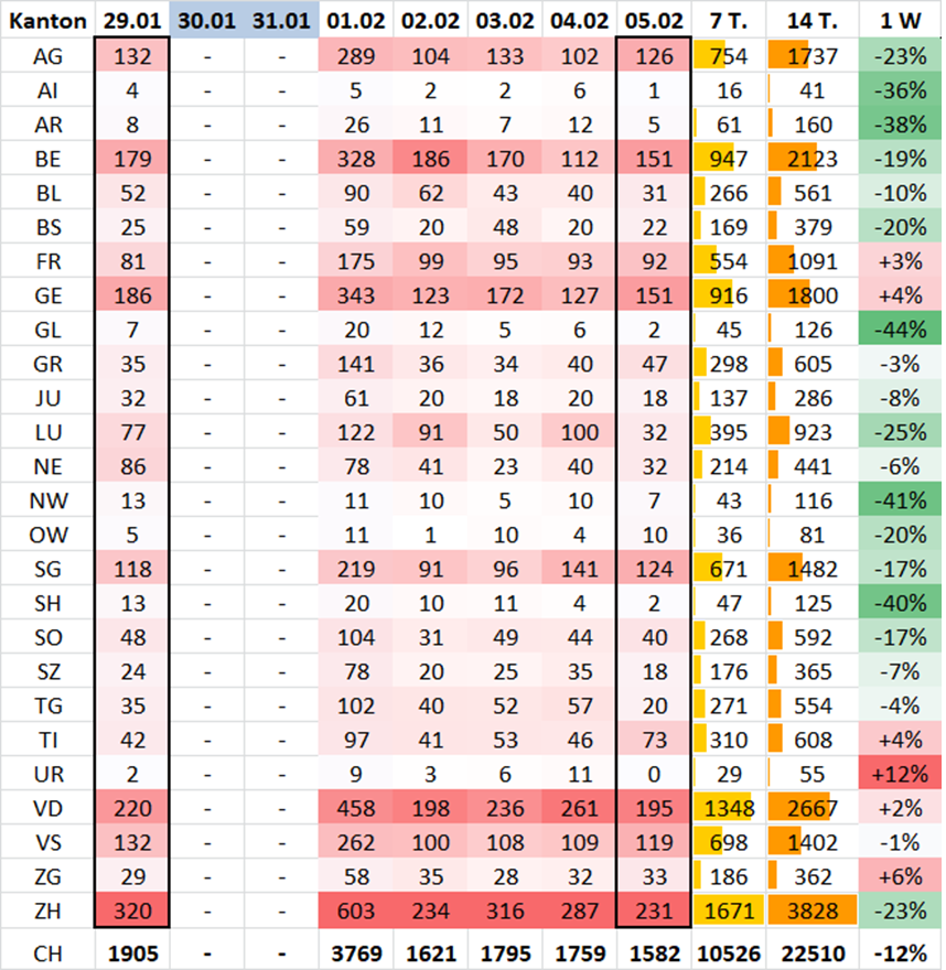Die Fallzahl ist tiefer als an den letzten zwei Sa-Mo, wo 4'703 und 4'320 gemeldet wurden.