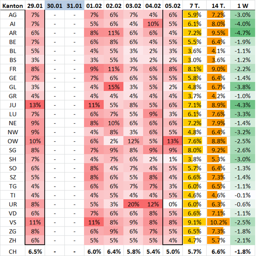 Veränd. in Prozent der Anz. Fälle pro Kanton in 1 Woche zur Vorwoche: