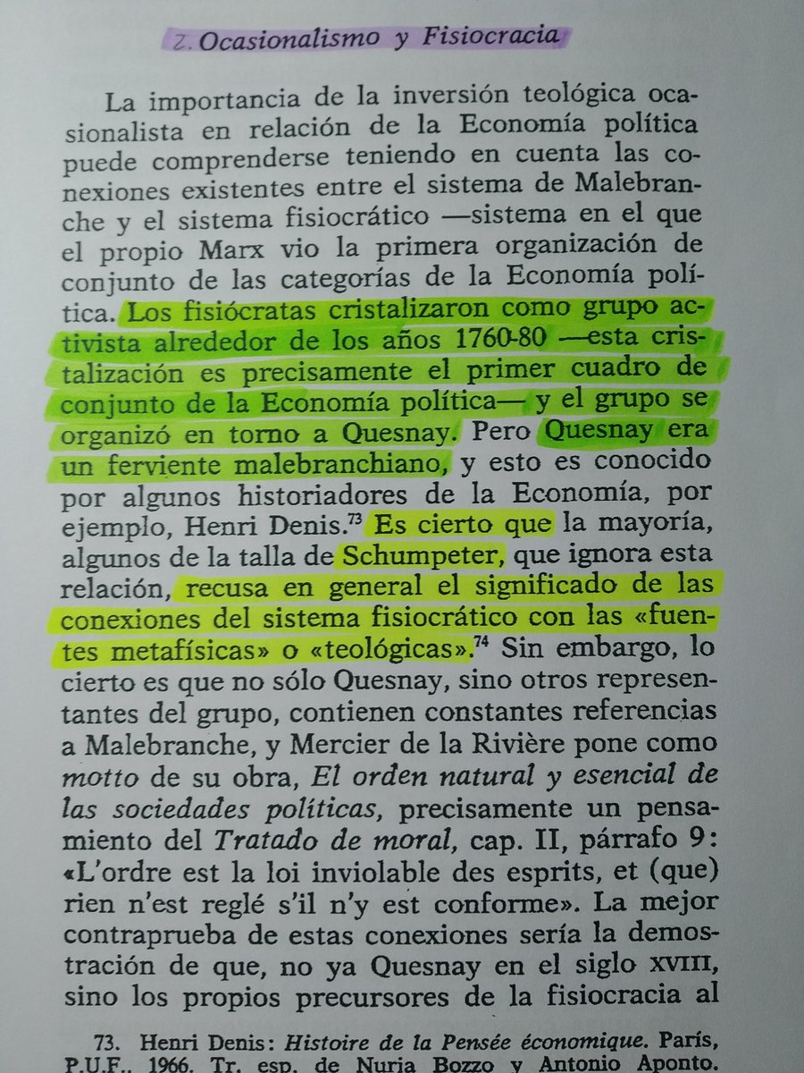 Bueno encuentra determinaciones teológicas en progressus hacia la economía política, de un lado, en la escuela económica de los fisiócratas (Quesnay), a través del Ocasionalismo de Malebranche; de otro lado, en la escuela económica clásica (Smith), a través de
