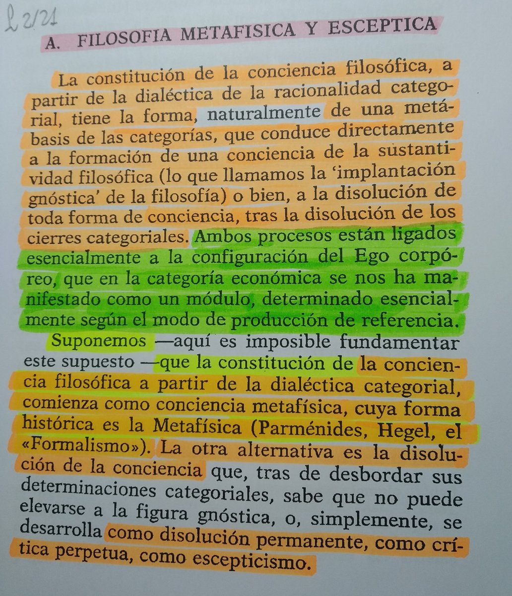 La constitución de la conciencia filosófica a partir de la dialéctica entre categorías (y a través del regressus de la categorialidad económica) toma en el límite la forma de una conciencia gnósticamente implantada, de una filosofía exenta o pura, o bien en la forma