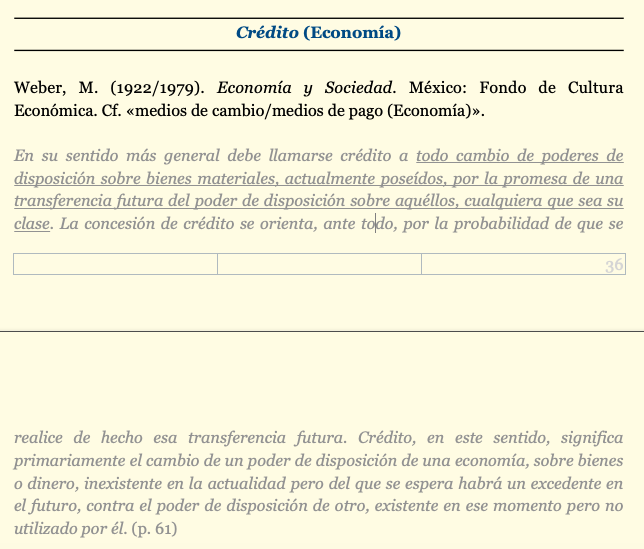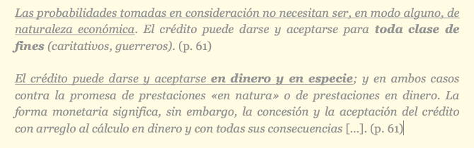Weber define el crédito tal y como lo entiendo como un dinero en potencia (poder de disposición de bienes y servicios) determinado hacia el acto por una promesa regulada.