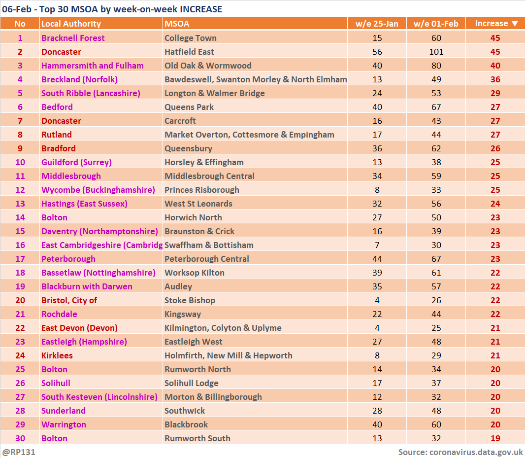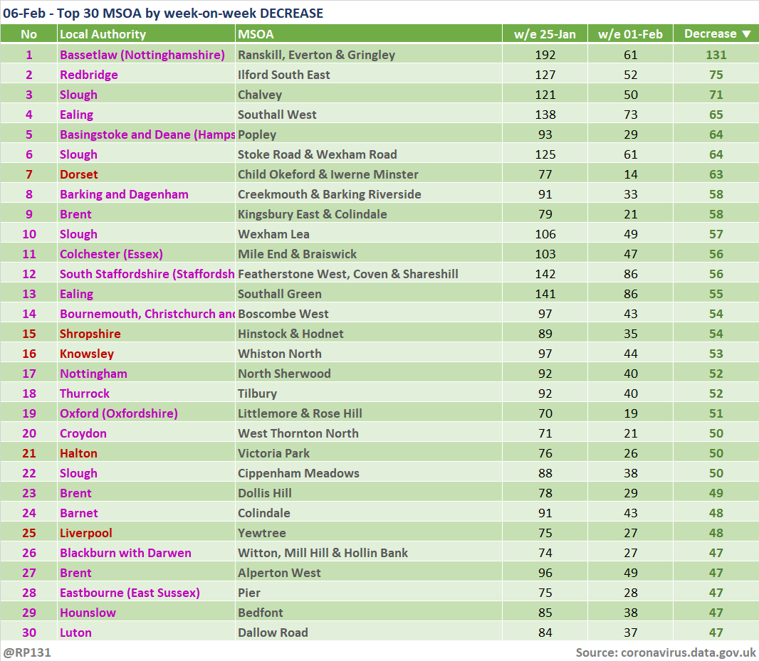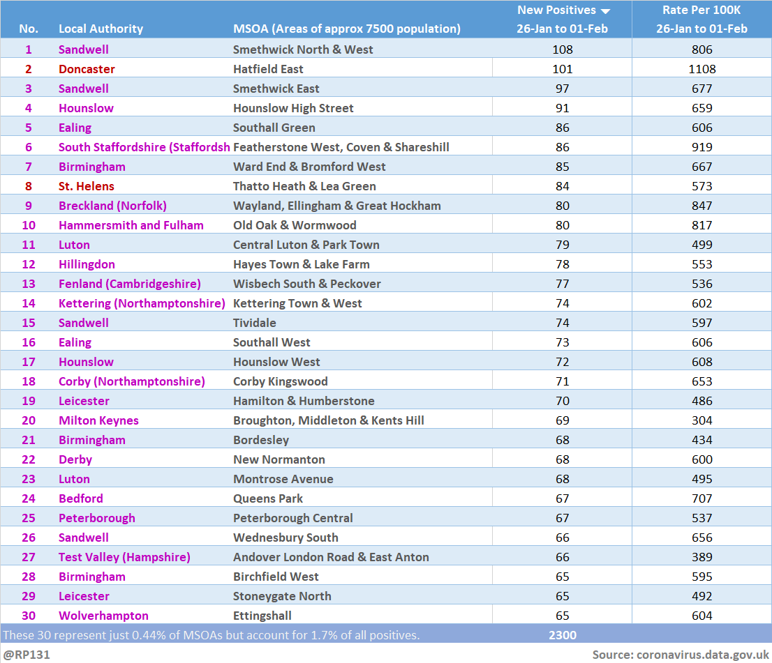 #covid19uk - Tables thread. Re-ordered now to put the more popular rate sorted table at the top. So this is top 50 England Local Authorities by positives per 100K population in last 7 days, up to 3 days ago. Bright green means lower than previous period.