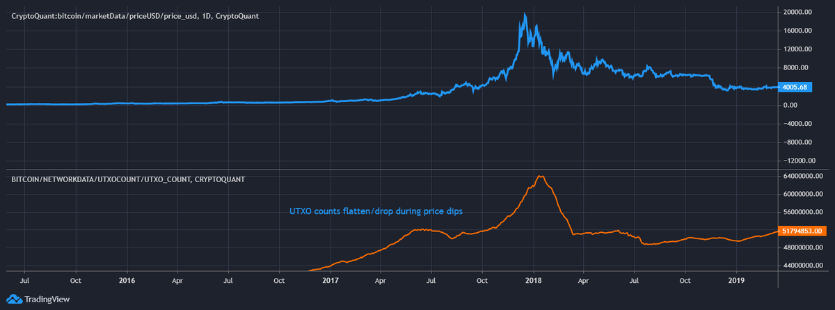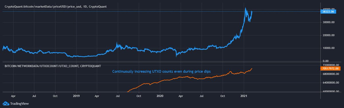 3/ keep rising, it usually means people are HODLing rather than spending or selling their BTC. During a bullrun, UTXOs in general would rise but we can try to break it down further to check if anything peculiar is happening in 2021 which was similar to 2013 or 2017.