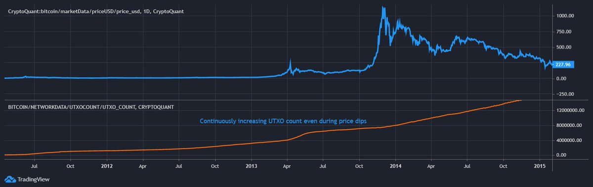 During the 2013 bullrun, UTXOs showed similar trend to what is happening now in 2021. Even during major price dips, UTXOs kept on increasing, thus signaling more strong hands in 2013 & 2021 than in 2017.