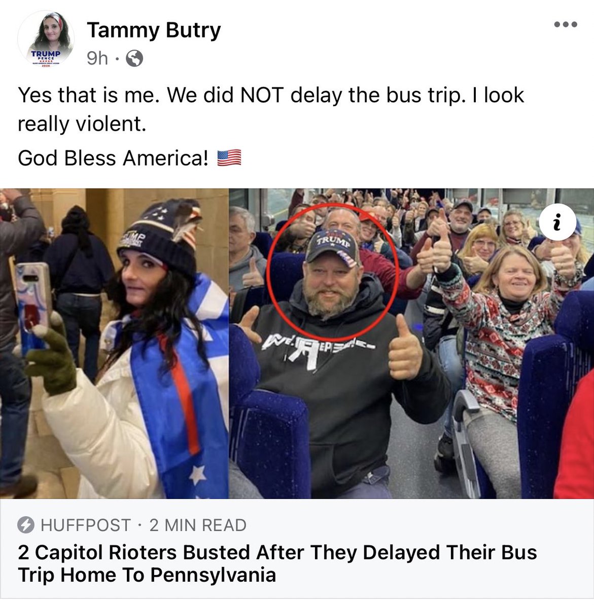 Capitol defendant Tammy Bronsburg (AKA Tammy Butry) was arrested, processed, and released on Thursday, according to court records. Since then, she’s been posting a bunch of internet garbage and conspiracy theories on Facebook. huffpost.com/entry/trump-bu…