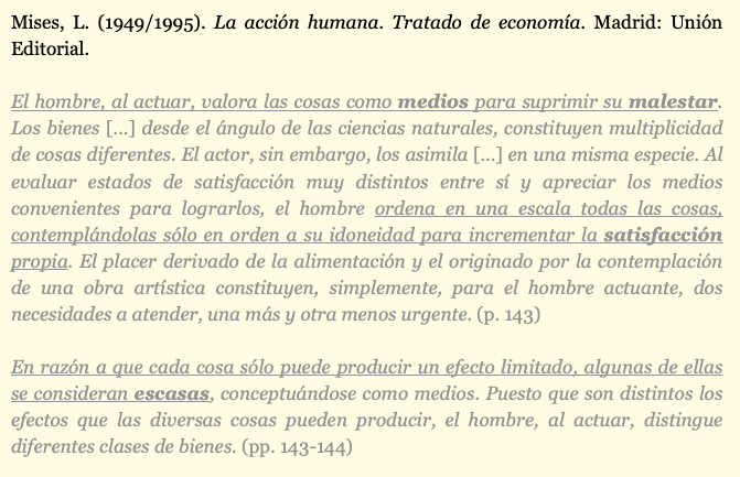 -Ludwig von Mises: "La acción humana. Tratado de economía". Teoría del valor económico (en el capítulo VII primer apartado, primera parte)-