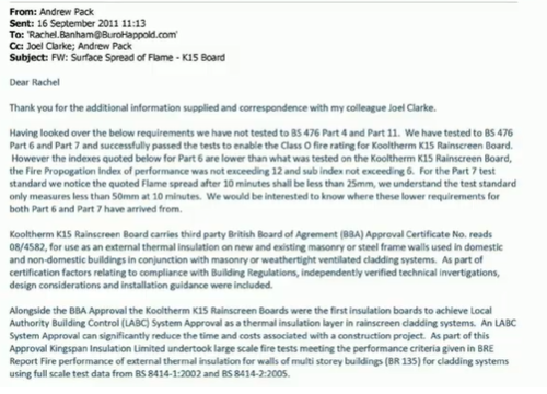 Spent quite a long time this morning on this 2011 email which shows Mr Pack advising re a project in Doha that was being built to compliance with UK codes. He implies that K15 was suitable for both masonry and steel frame + had tested to BS8414 parts 1 and 2