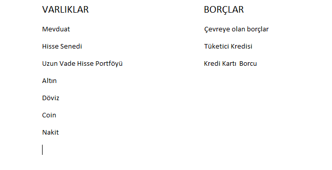 2⃣ koyduğumuz hedeflerin neresinde olduğumuzu daha iyi görürüz. Maddeleri kendi durumunuza göre uyarlayıp yanlarına tutarları yazıp, varlıklardan borçları mahsup ettiğinizde çıkan değer sizin finansal durumunuzu gösterecektir.+