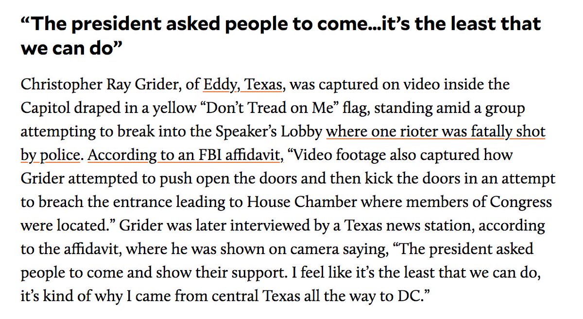 According to our investigation, of the 194 federal criminal cases brought against insurrectionists so far, at least 13 people charged cited Trump explicitly as the reason they marched on the Capitol. Here’s a list. bit.ly/3p5rJ1I