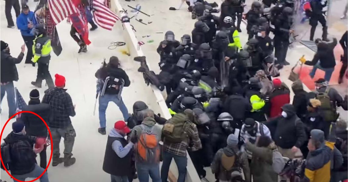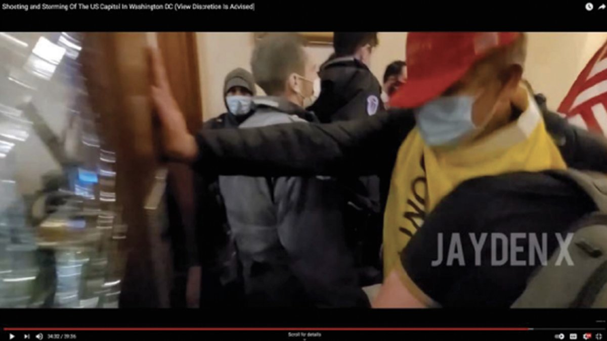 Next: we see rioters “surge” toward Officer Goodman as they breach the doors of the Capitol building.