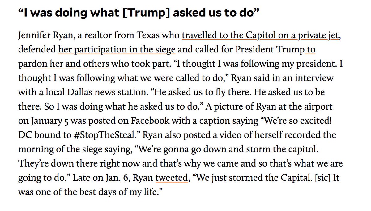 Jennifer Ryan, a realtor from Texas who traveled to the Capitol on a private jet, defended her participation in the siege and called for Trump to pardon her and others who took part: “I thought I was following my president. I thought I was following what we were called to do.”