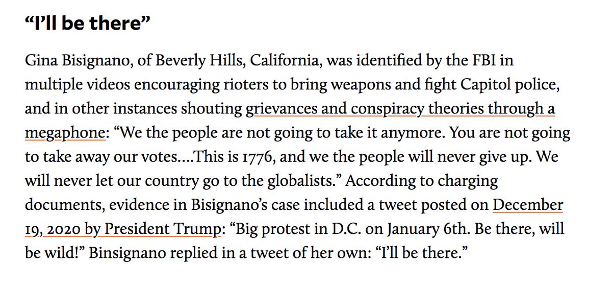 According to charging documents, Gina Bisignano, of Beverly Hills, California, allegedly tweeted a response to President Trump’s December 19 call to protest in D.C. on January 6th: “I’ll be there.”