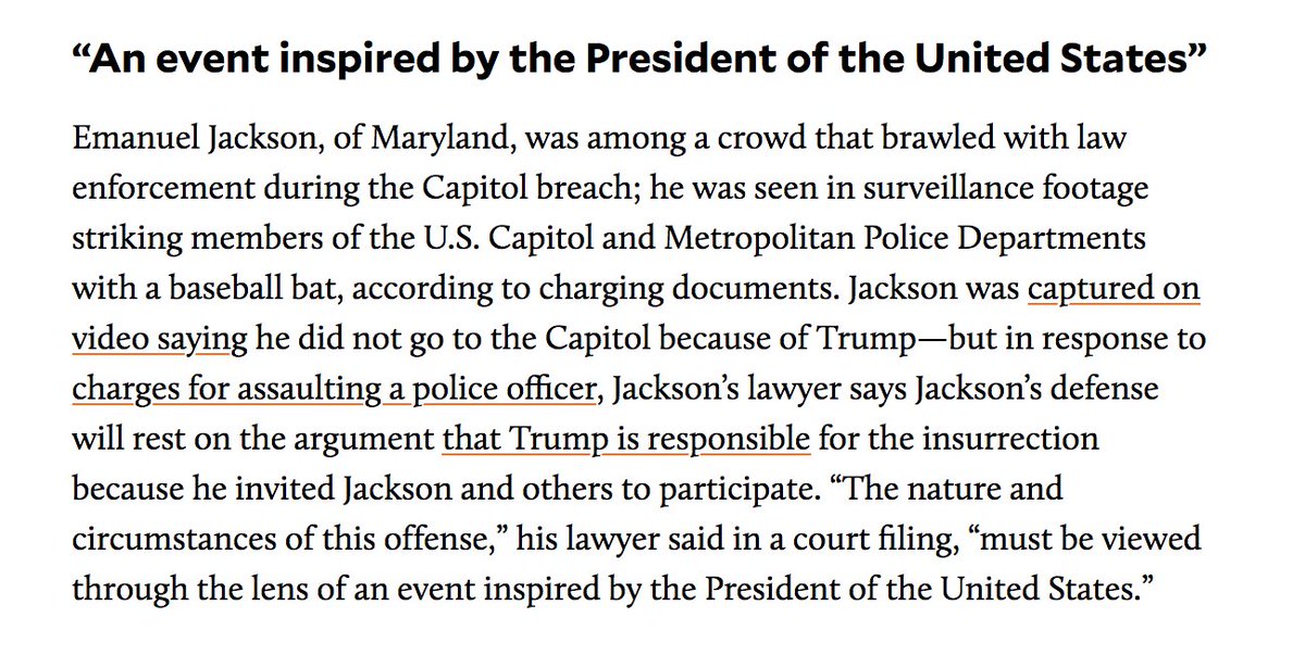 Maryland resident Emanuel Jackson’s lawyer says Jackson’s defense will hinge on the argument that Trump is responsible for the insurrection because he invited Jackson and others to participate: “An event inspired by the President of the United States.”