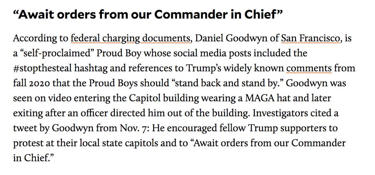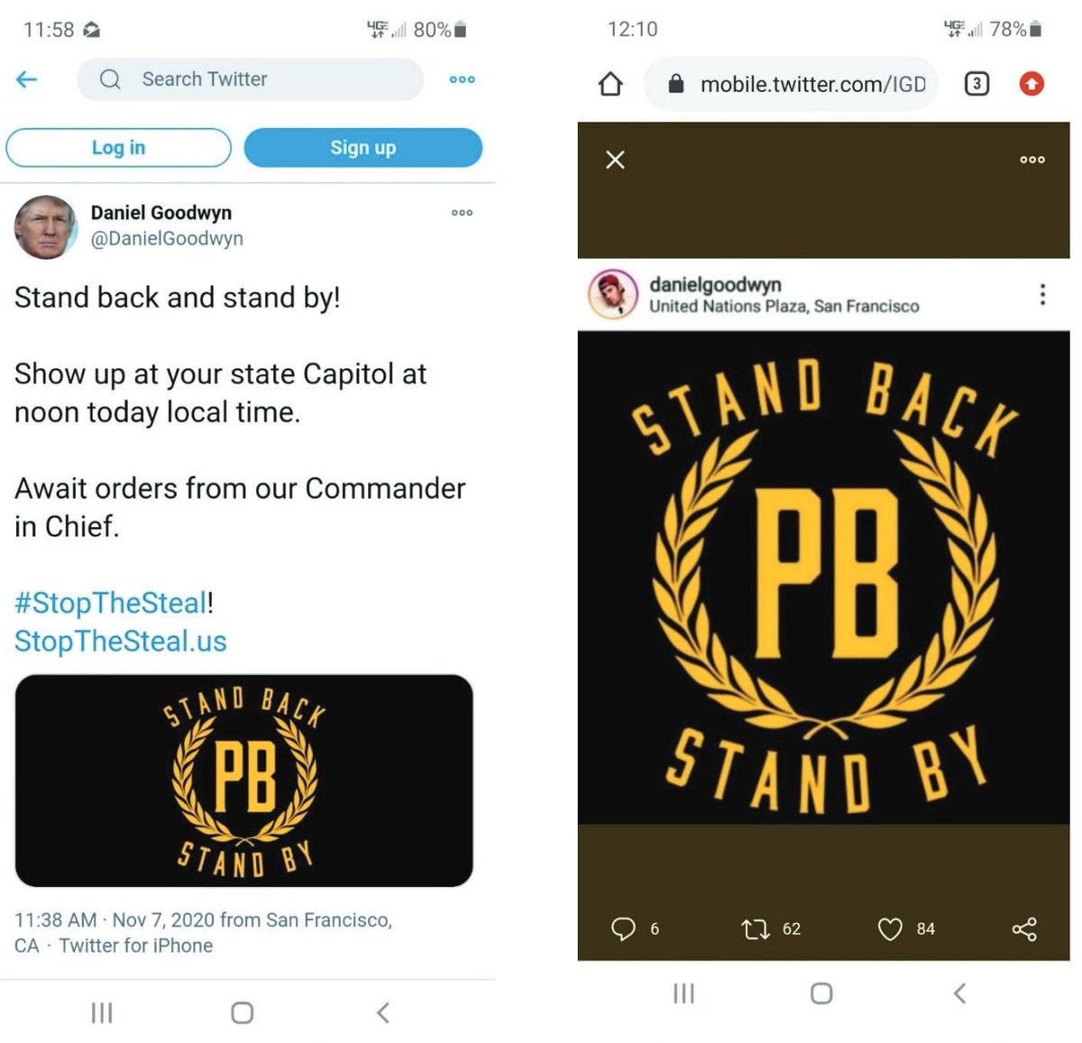 Daniel Goodwyn of San Francisco, a “self-proclaimed” Proud Boy, allegedly posted a tweet encouraging fellow Trump supporters to protest at their local state capitols and to “await orders from our Commander in Chief."