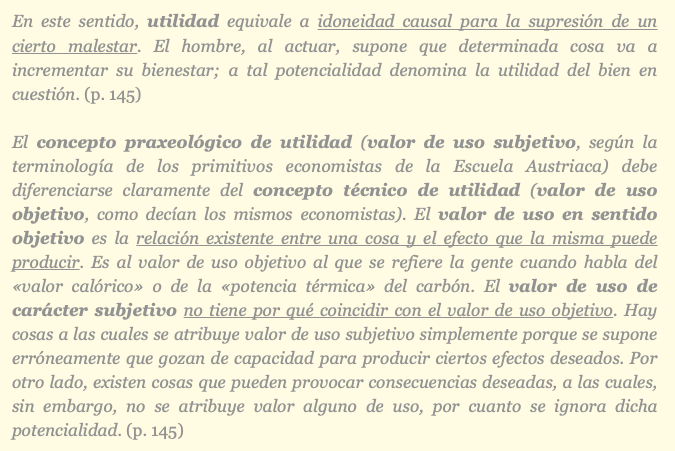 Distingue entre un "concepto praxeológico de utilidad" ("valor de uso subjetivo") y un "concepto técnico de utilidad" ("valor de uso objetivo").