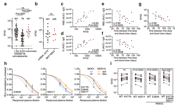 Agora, a atividade de neutralização contra as variantes do SARS-CoV-2 com a mutação E484K e N501Y ou a combinação K417N:E484K:N501Y foi reduzida numa margem pequena, mas significativa. Algumas dessas mutações são vistas na variante emergente da África do Sul (B.1.351)