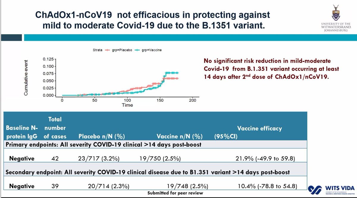 O estudo na forma de preprint que também será submetido pra análise por pares (peer-review) demonstrou uma eficácia reduzida contra a infecção por SARS-CoV-2 leve a moderada da variante do coronavírus B.1.351