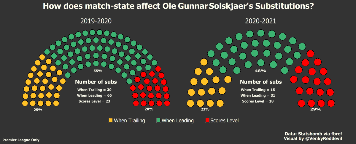 United have had to come back and win multiple times this season. This is reflective of the fact that United have made ~50% of their substitutions when the scores were level or when they have trailed.