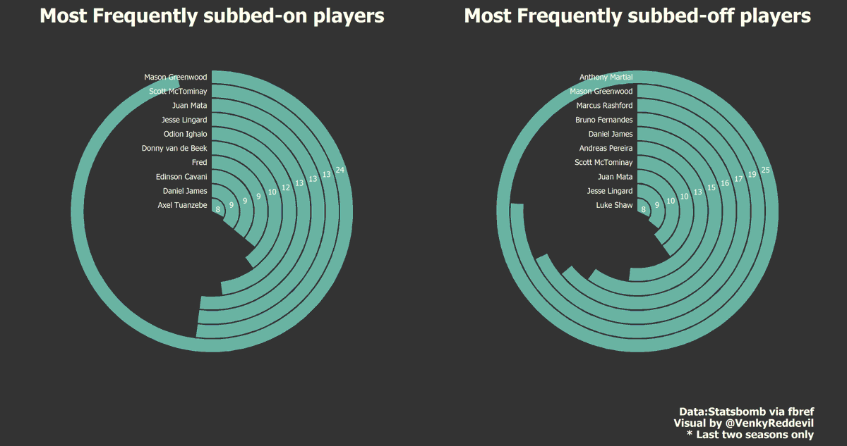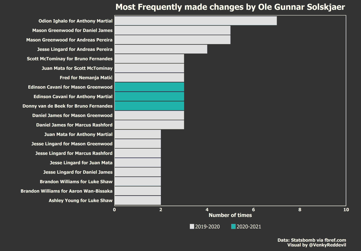 Mason Greenwood was gradually integrated into this side, with the forward being the most subbed on player by Ole in the last two seasons and unsurprisingly Martial being the most frequently ‘subbed-off’ player.