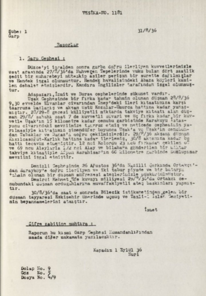 8- Bu arada ihanet beyannameleri atılmaya devam ediyordu. İsmet Paşa Bilecik üzerinden gelen bir düşman teyyaresinin Eskişehir'e Teali İslam Cemiyeti'nin ihanet beyannamelerini attığını rapor ediyordu.