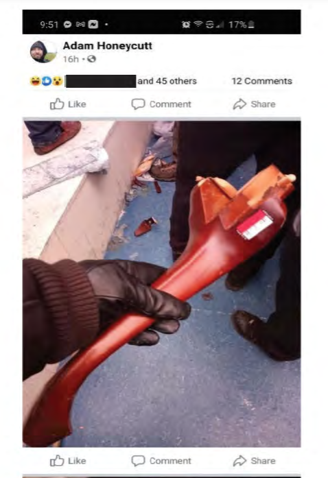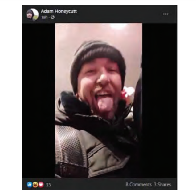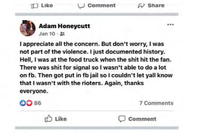 The FBI tracked down Florida bail bondsman Adam Honeycutt after he posted a pic online of a broken chair leg from the Capitol. Honeycutt later downplayed his role in breaching the building saying he was "at the food truck when the shit hit the fan."