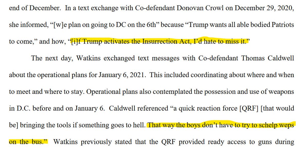 In December, Watkins texted co-defendant Donovan Crowl "if Trump activates the Insurrection Act, I'd hate to miss it."