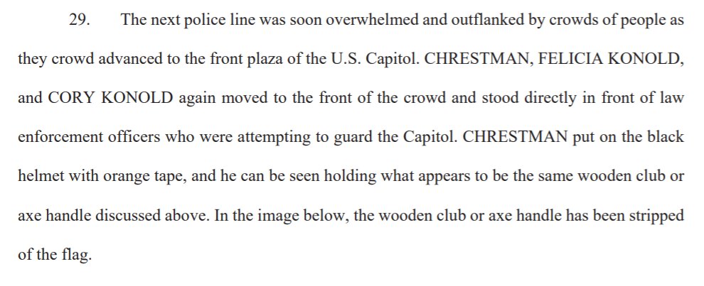 Prosecutors say that after the police barricades were breached, Chrestman donned his helmet and brandished a wooden club.