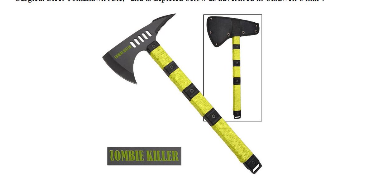 Preparing for the December event, prosecutors say, Caldwell researched weapons, including this "Zombie Killer" surgical steel tomahawk axe.