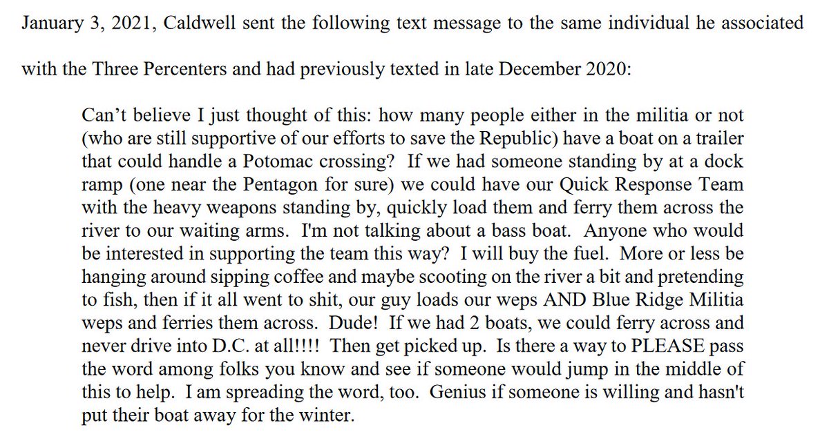 Here is Oath Keeper Thomas Caldwell texting a fellow militiaman & suggesting that they get a boat capable of crossing the Potomac ready for a Quick Response Team with "heavy weapons."