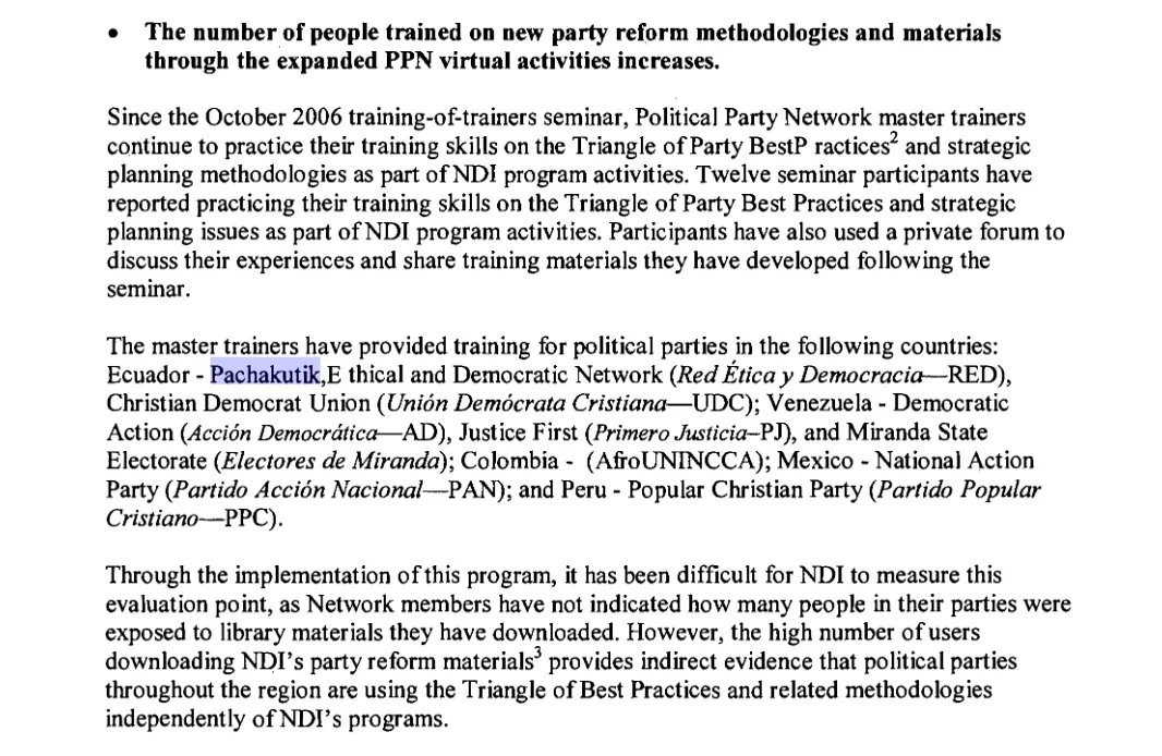 Desde 2006 miembros de Pachakutik fueron entrenados por la NDI con otros partidos de extrema derecha como el PAN de México, PJ de Venezuela o PPC de Perú.