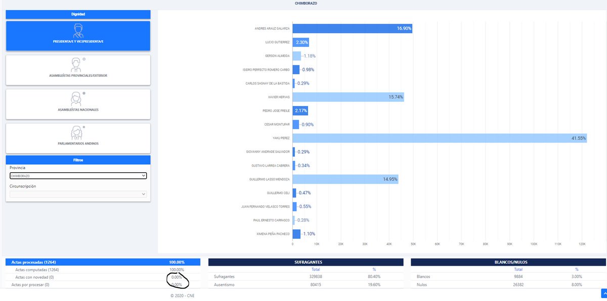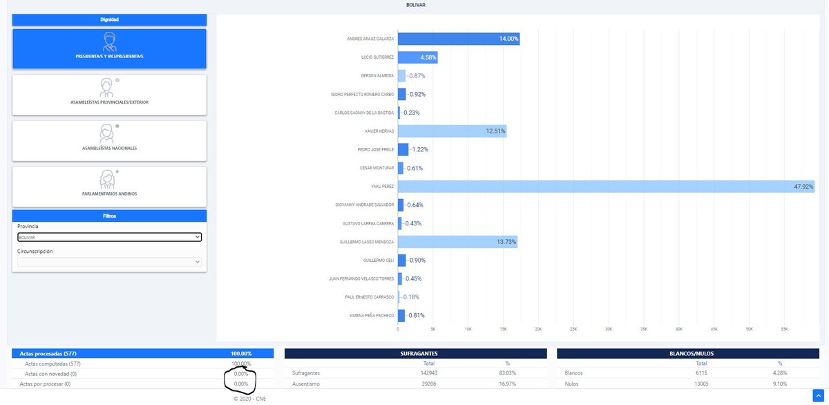 De hecho el CNE en la RDP manipuló los datos oficiales seleccionando solo un 90% de las actas, dándole a Arauz un 31% cuando tenía un 33%, dándole un 20% a Yaku en segundo lugar cuando tenía 19,2% en tercer lugar, y le dio 19,9% en tercer lugar, cuando tenía 19,4% en 2º